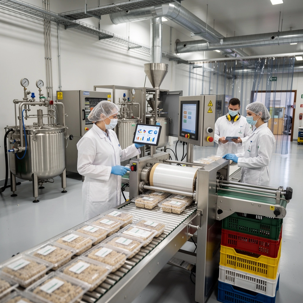 Les lignes de conditionnement intègrent des machines de dosage, remplissage, operculage et étiquetage. Les systèmes d’emballage sous atmosphère modifiée prolongent la conservation. Le matériel de palettisation automatise la préparation des expéditions.